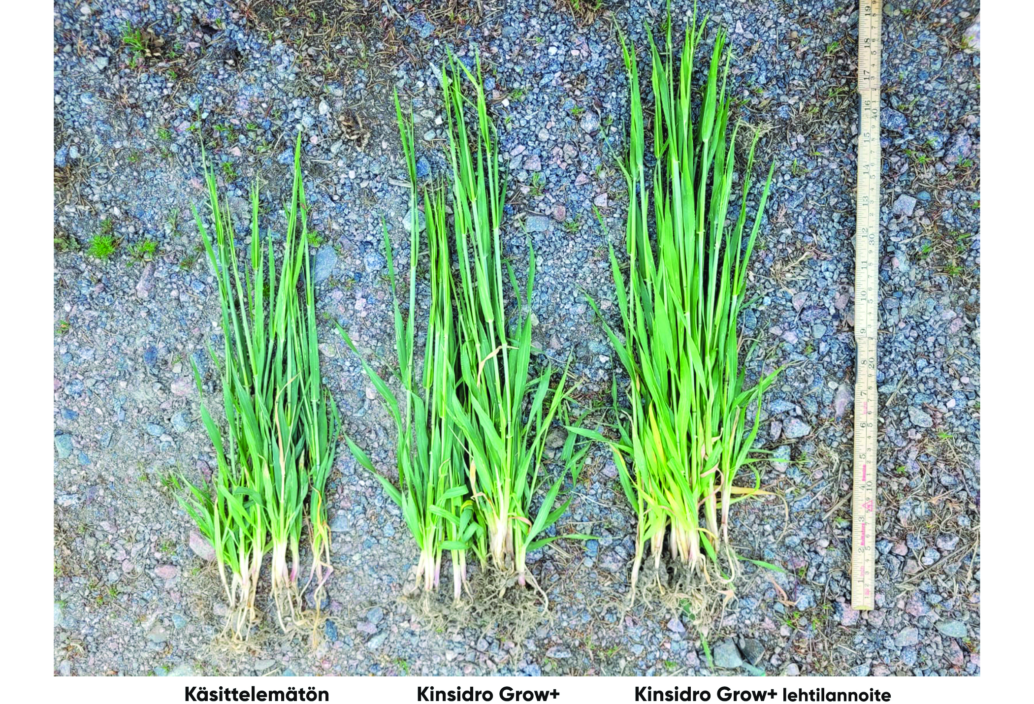 Humus- ja fulvohapot, joihin on sidottu hivenravinteita ainutlaatuisessa Kinsidro™ Grow+ - formulaatiossa, vaikuttavat kasvien aktiivisuuteen, lisäävät klorofyllin määrää ja parantavat siten fotosynteesin tehokkuutta, aktivoivat monia entsyymejä ja stimuloivat tiettyjen hormonien toimintaa. Tällä tavalla ne stimuloivat solujen jakautumista ja kasvua sekä juurien, versojen ja lehtien kehitystä.